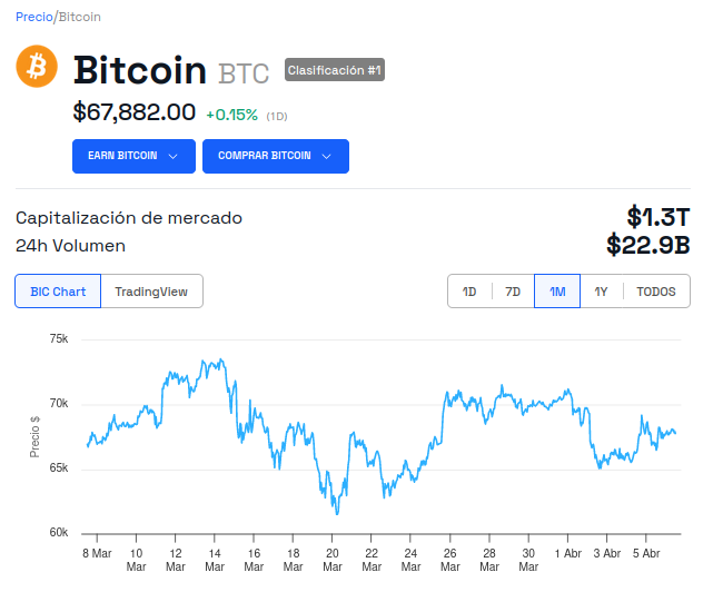 Al momento de la publicación, BTC cotiza en 67,882 dólares tras aumentar un leve 0.15% en las últimas 24 horas. A pesar de la reciente tendencia bajista, existe optimismo sobre la posibilidad de que la criptomoneda supere los 70,000 dólares este fin de semana.