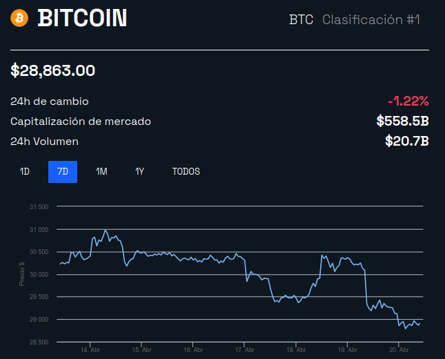 Al momento de la publicación, el precio de Bitcoin se ubica en 28,863 dólares, tras caer 1.22% en las últimas 24 horas, según los datos de BeInCrypto.