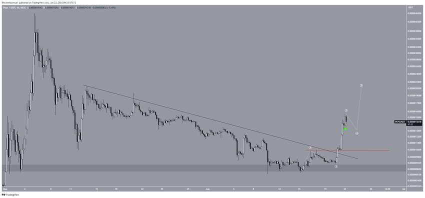 El análisis técnico del gráfico de cuatro horas a corto plazo proporciona una predicción más alcista para el precio del token PEPE. Esto se debe tanto a la teoría de las ondas de Elliott como a la acción del precio.