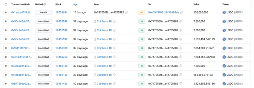 Específicamente, la dirección 0x45a envió 295,86 millones de USDC a Coinbase. Posteriormente, las direcciones 0x29d y 0x41d transfirieron cada una 350 millones de USDC. Además, las direcciones 0xbdE y 0xeC9 contribuyeron con 150 millones de USDC cada una, lo que culminó en casi 1,300 millones de dólares.