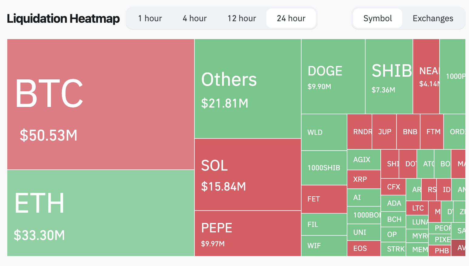 Datos de CoinGlass muestran que Ethereum es la segunda criptomoneda con más liquidaciones masivas, las cuales son de 33,30 millones de dólares cada 24 horas en promedio (sin contar la última ballena), mientras que la de Bitcoin es de 50,53 millones de dólares.