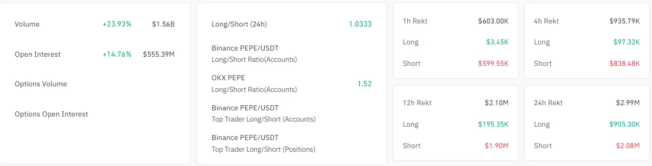 Durante el mismo período, los traders largos también vieron pérdidas que ascendieron a unos 907,000 dólares. Al mismo tiempo, el interés abierto en futuros de PEPE saltó 15%, superando los 500 millones de dólares—un nivel visto por última vez en enero.