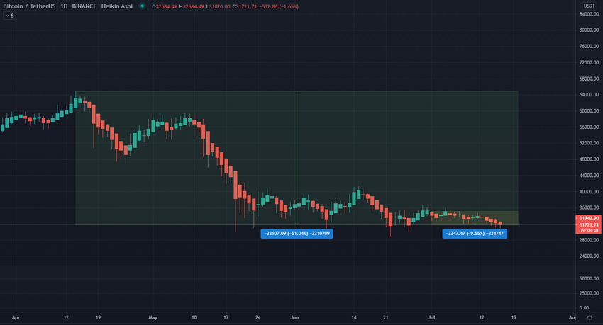 Bitcoin tiene un precio actual de 31,800 dólares. Bajó casi un 10% para el mes de Julio, mientras que bajó un considerable 51% desde el máximo histórico de 64,000 dólares establecido en abril.