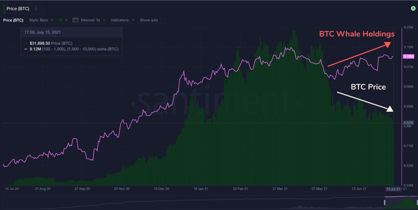 Bitcoin ha alcanzado un nuevo mínimo mensual de 31,000 dólares para el mes de Julio. Sin embargo, según la firma de análisis on-chain Santiment, las grandes direcciones de Bitcoin continúan acumulando a medida que baja el precio.