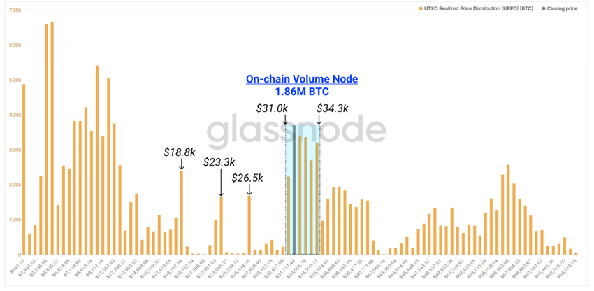 Bitcoin ha visto transacciones de más de 1,86 millones de BTC on-chain, entre el rango de precios de 31,000 dólares y 34,300 dólares. Esto equivale al 9,93% del suministro circulante. De acuerdo a Glassnode:
