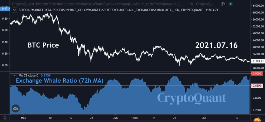 El CEO de CryptoQuant, Ki Young Ju tuiteó recientemente que “la presión de venta de BTC parece ser alta”. Según Ju, el indicador muestra que la tasa de intercambio de ballenas es superior al 85%: