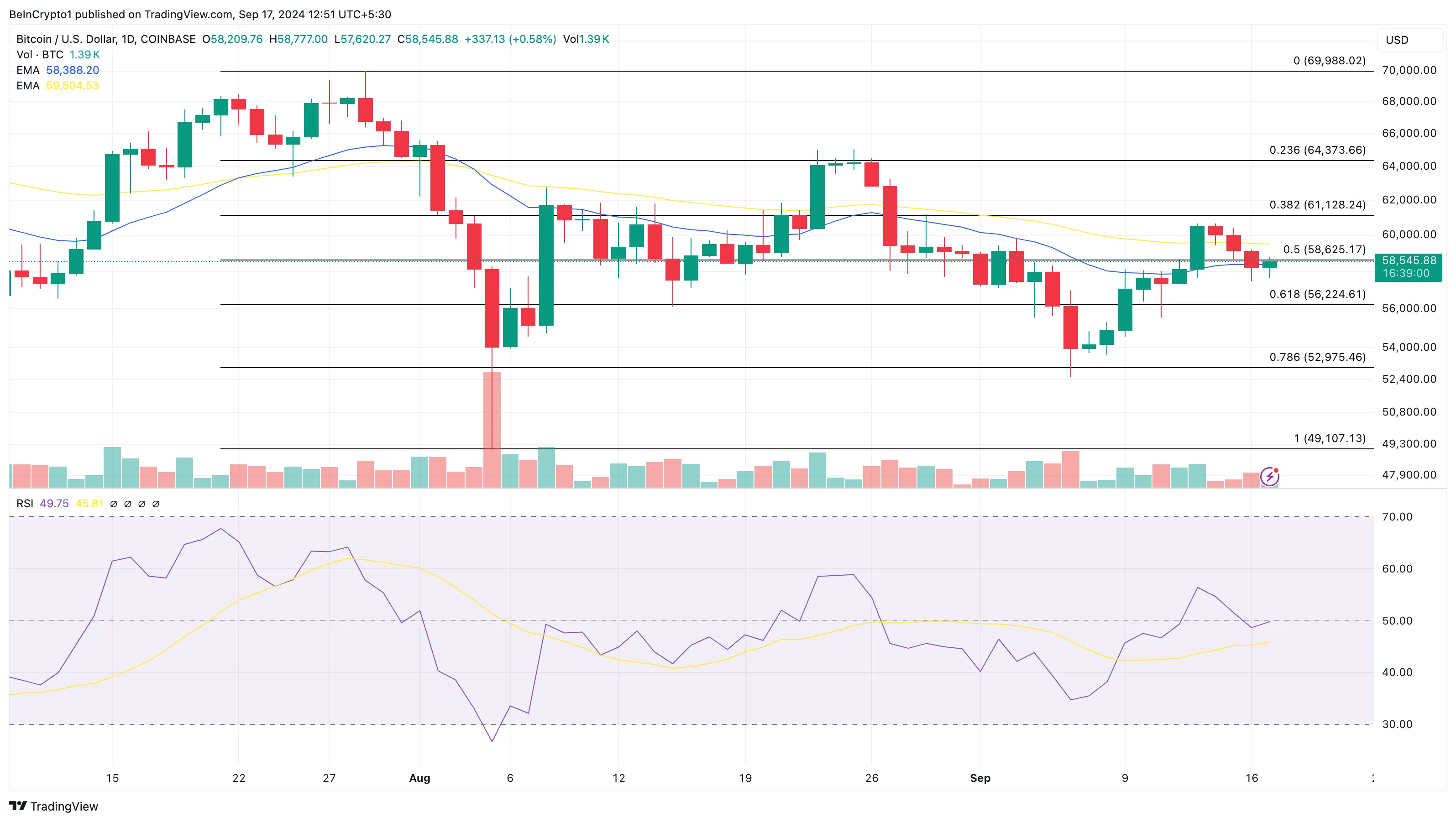 En el gráfico diario, el precio de Bitcoin está luchando con la Media Móvil Exponencial (EMA) de 20 días. Cotizando a 58,646 dólares, esta posición implica que los alcistas aún no tienen un camino claro para impulsar el precio al alza. En cambio, los bajistas han continuado ejerciendo presión, manteniendo a raya el impulso ascendente de Bitcoin.