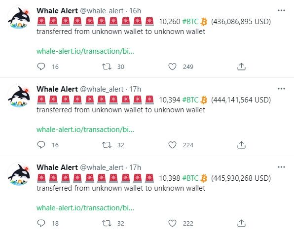 De acuerdo a los datos suministrados por el rastreador Whale Alert, desde el viernes 6 de agosto se han registrado varias transacciones masivas de Bitcoin, con montos que varían entre 10,200 BTC a 10,400 BTC cada una.