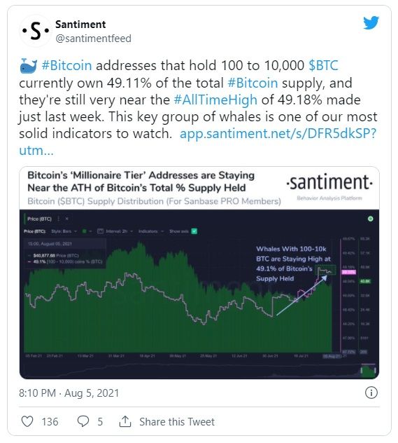 El día de ayer, Santiment también informó que las ballenas Bitcoin que tienen entre 100 y 10,000 BTC en sus monederos poseen 49,11% del suministro total de Bitcoin, muy cerca del ATH registrado hace una semana en 49,18%.