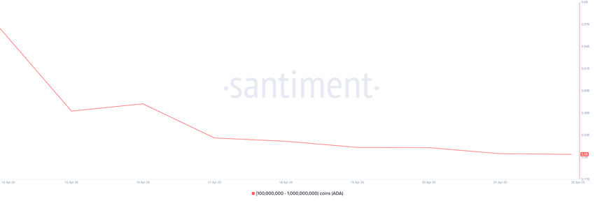 El pobre rendimiento de Cardano durante la última semana ha llevado a algunos de sus mayores holders a vender sus tokens. Los datos on-chain revelan que las ballenas que poseen entre 100 millones y 1 mil millones de ADA han vendido colectivamente más de 160 millones de dólares del activo en los últimos siete días.