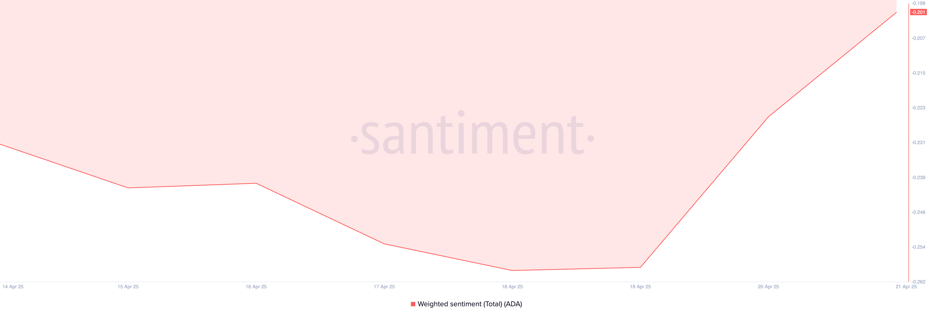 Según Santiment, el sentimiento ponderado de ADA ha permanecido por debajo de cero desde el 8 de marzo, indicando que las discusiones y perspectivas bajistas continúan superando a las alcistas.