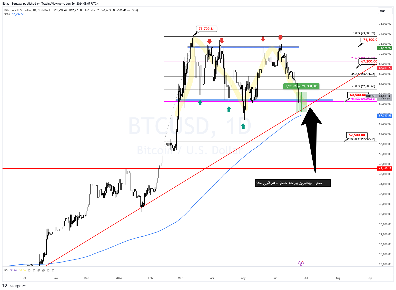 Técnicamente, se esperaba el aumento de ayer después de que el precio de Bitcoin (BTC) no alcanzara la fuerte zona de soporte de alrededor de 60,500 dólares.