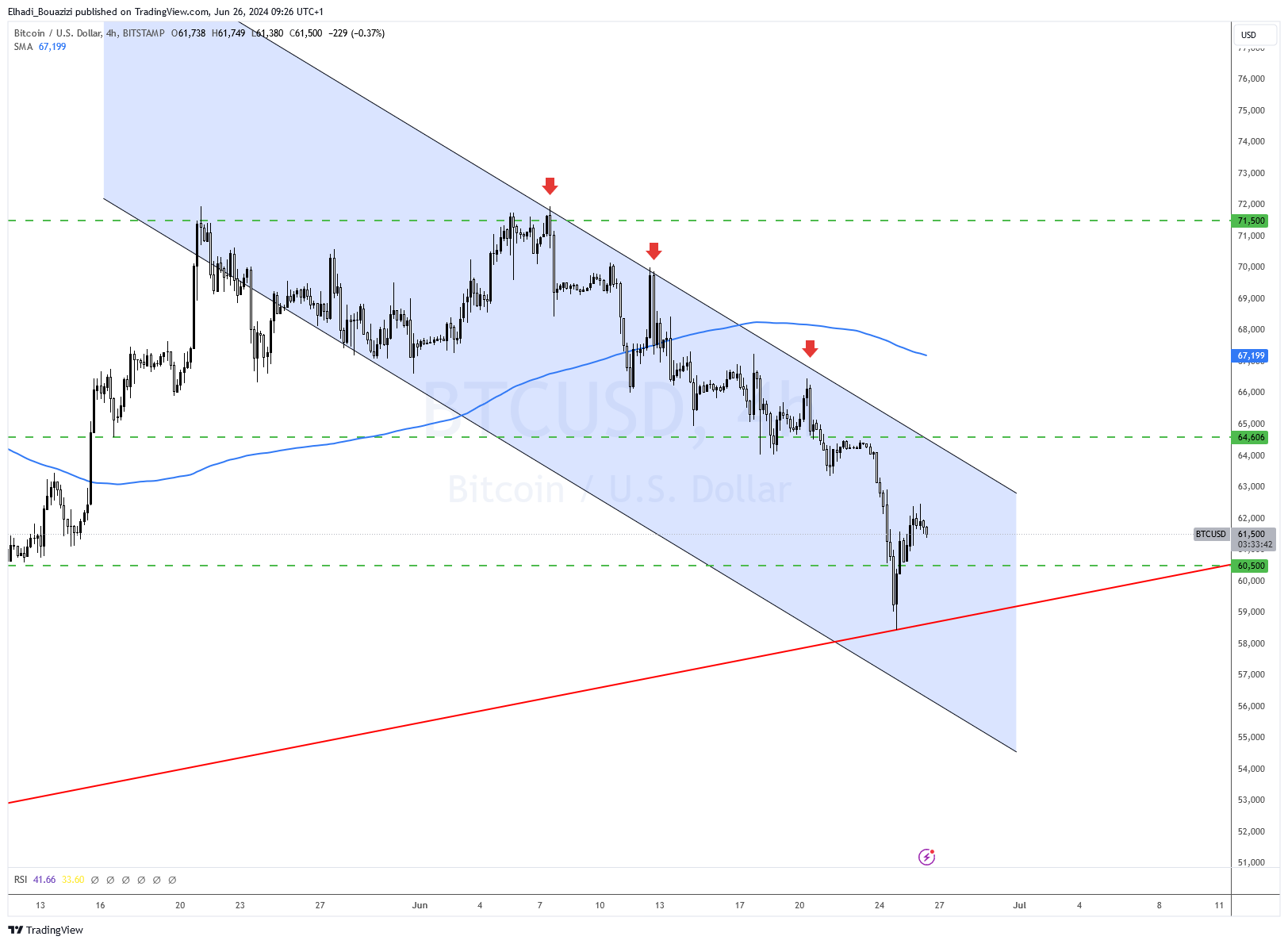Para volver al alza, el precio de BTC debe romper el límite superior del canal de precios bajista en el que se negocia en el gráfico de 4 horas y también cerrando por encima del nivel de resistencia de 64,600 dólares.