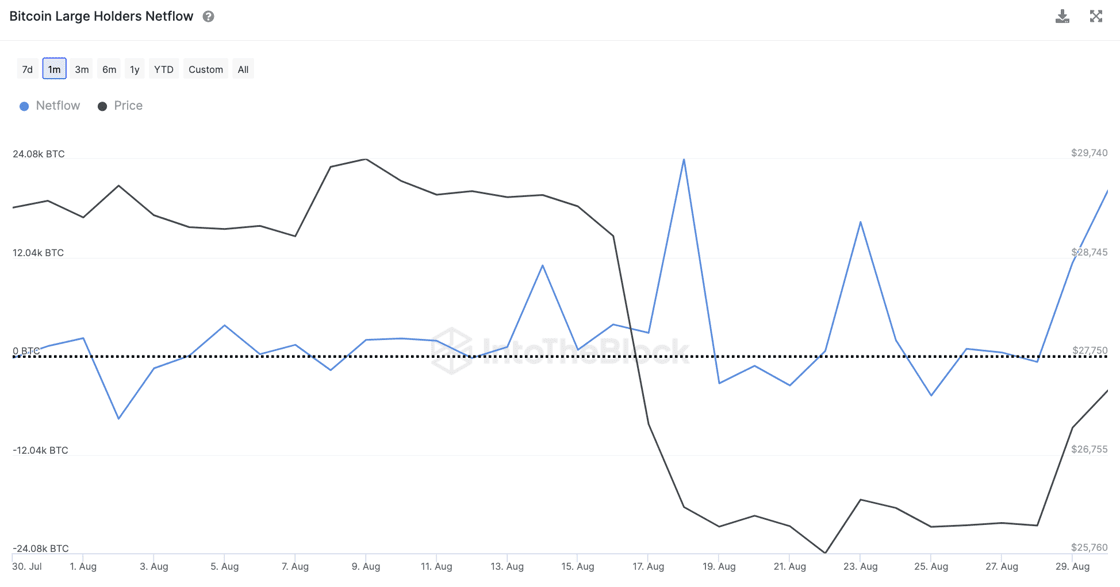 En agosto, Bitcoin alcanzó un mínimo de dos meses, que mantiene al margen de un breve aumento. Según la plataforma de análisis IntoTheBlock, las direcciones de monedero con al menos el 0,1% del suministro de BTC utilizaron esta caída para aumentar aún más sus tenencias.