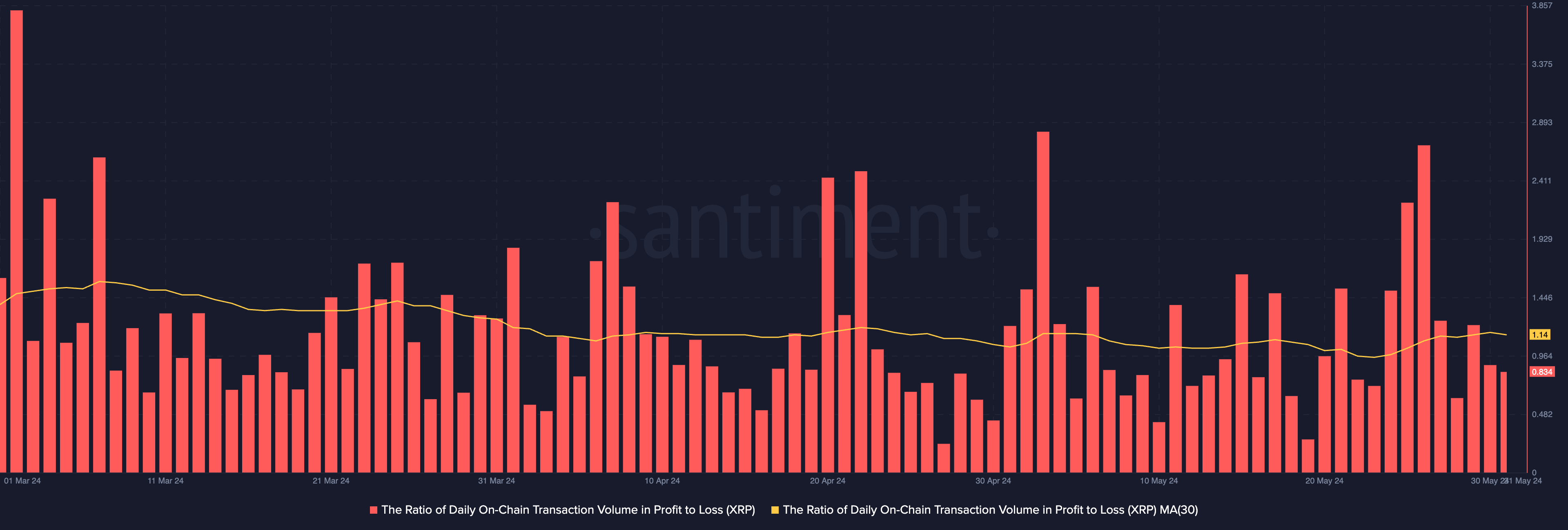 Es posible que esta categoría de holders de XRP haya llenado sus carteras de inversión debido a las rentables transacciones relacionadas con la altcoin en las últimas semanas. Una evaluación de la relación diaria de XRP entre el volumen de transacciones en ganancias y pérdidas arrojó un valor de 1,14.