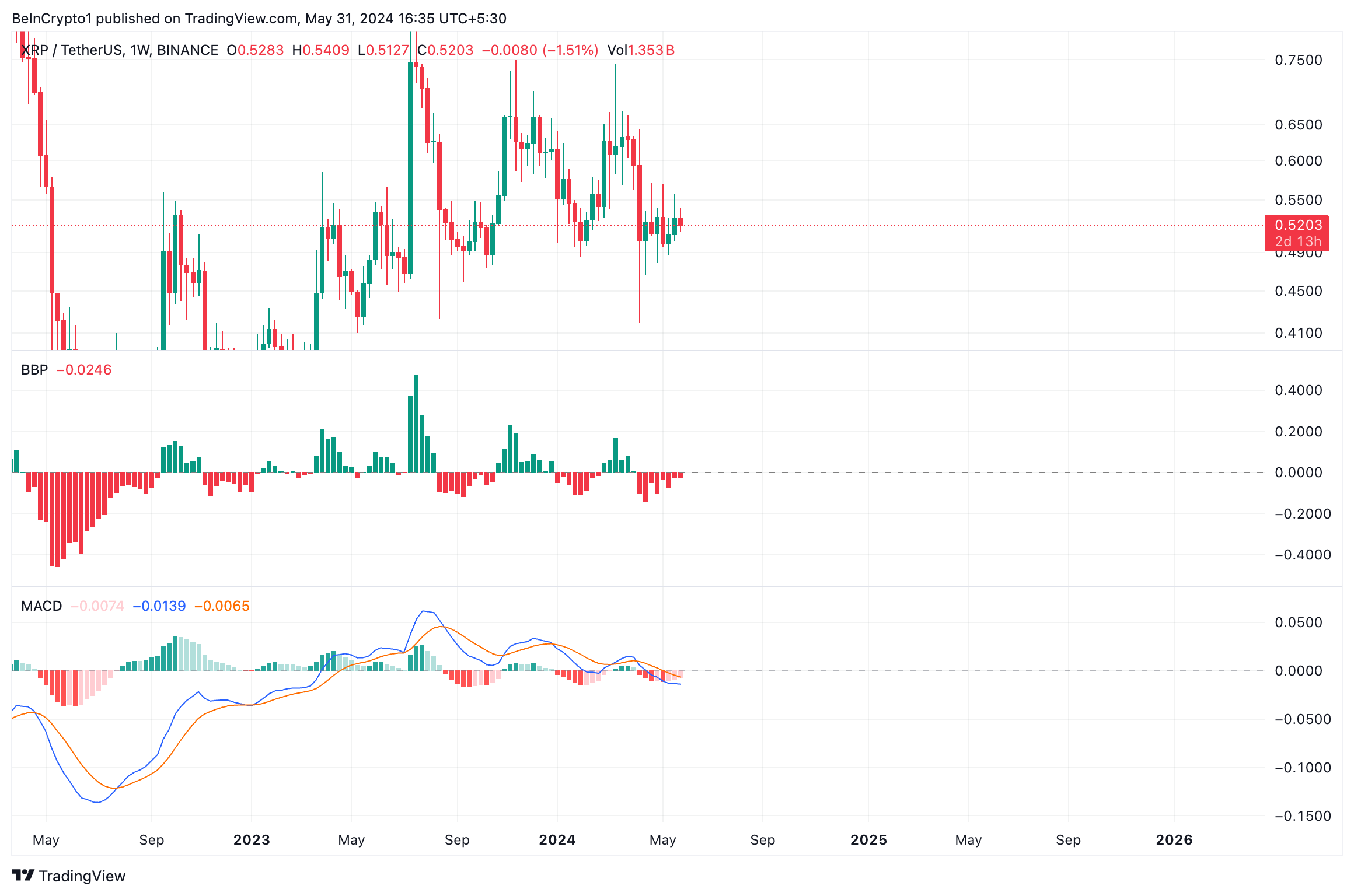 En el momento de escribir este artículo, la línea MACD de XRP tiende a la baja, lo que indica un pico en las ventas de tokens. Si esta tendencia continúa, el valor del token puede caer por debajo de 0.5 dólares para negociarse a 0.41 dólares.