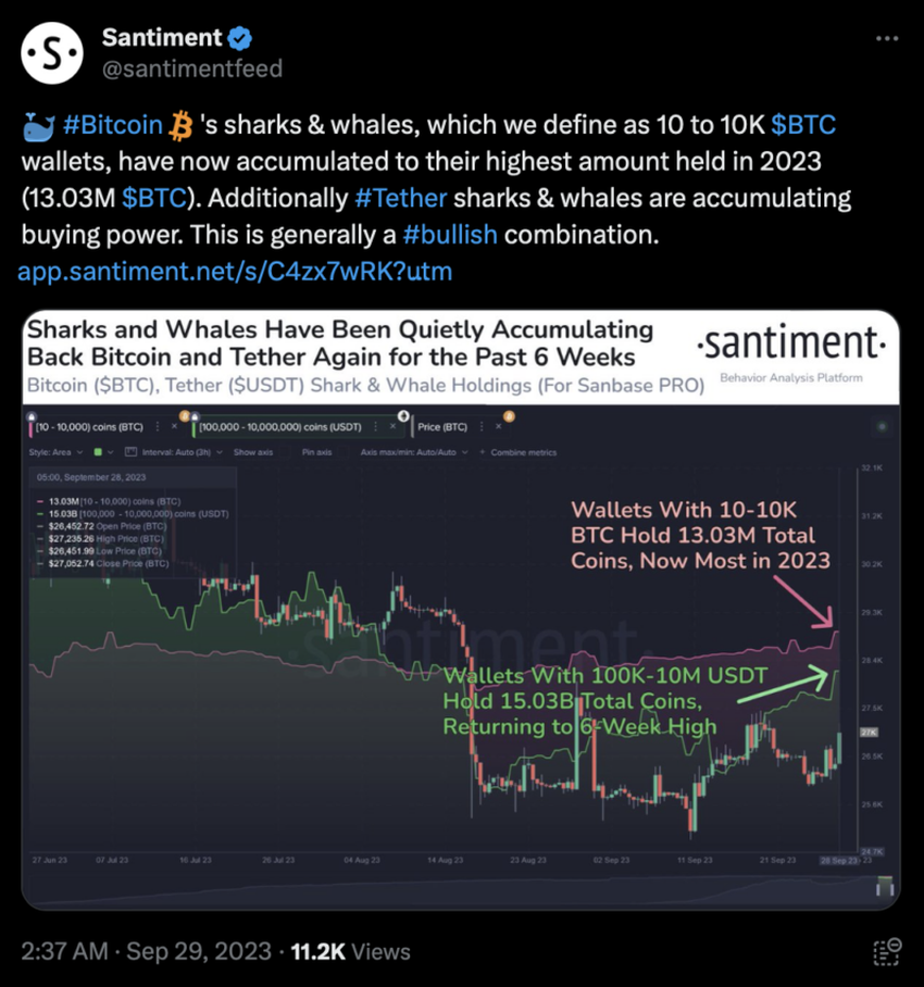 Los analistas de Santiment señalaron que los “tiburones” y las “ballenas”, direcciones que almacenan de 10 a 10.000 BTC, controlan más del 66% del suministro circulante de la criptomoneda insignia.