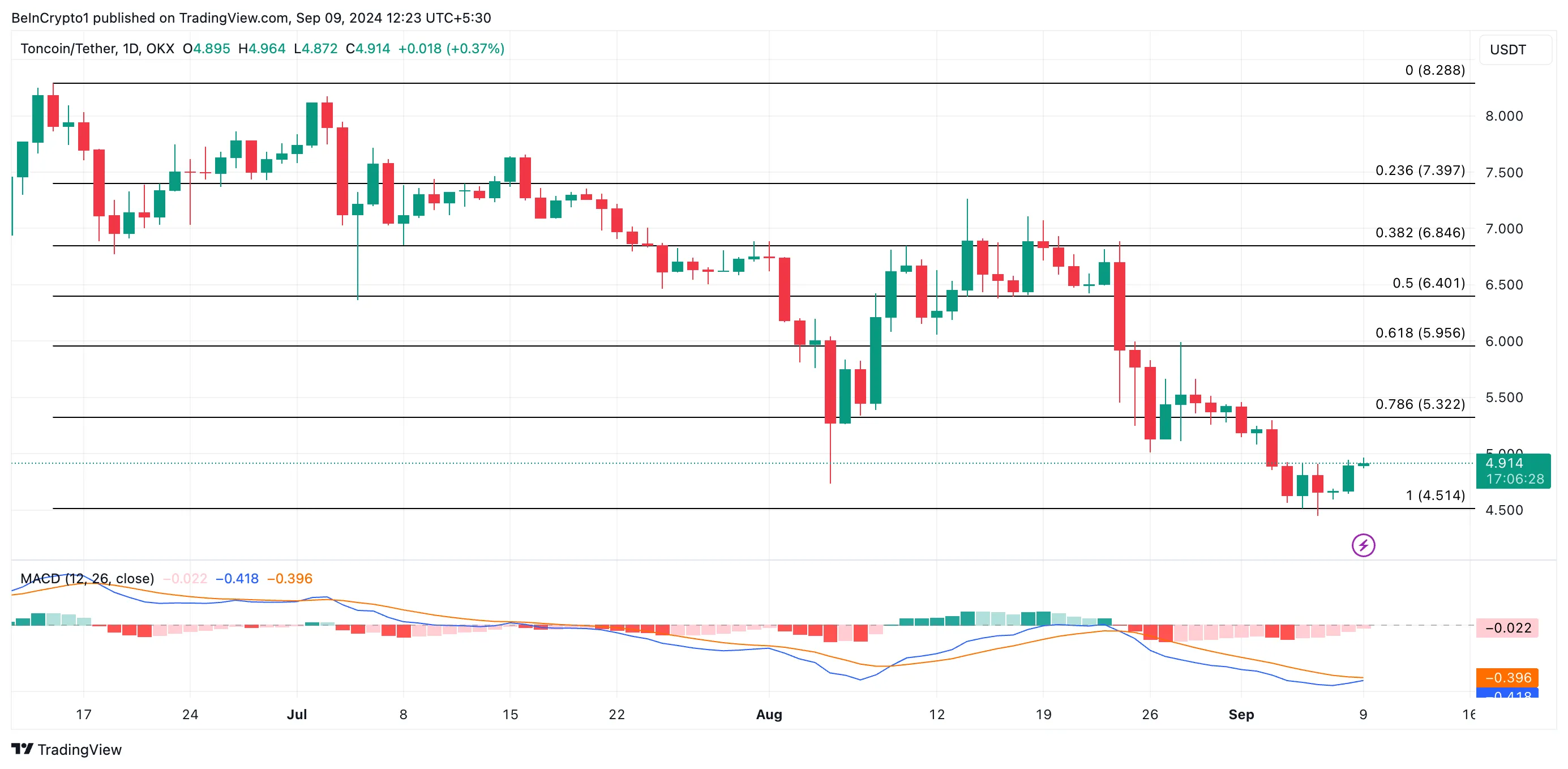 Si la demanda de TON continúa creciendo, este impulso alcista podría empujar el token hacia 5,32 dólares, donde probaría un nivel de soporte crítico. Un avance exitoso podría establecer el próximo objetivo de precio en 5,95 dólares. Sin embargo, si la toma de beneficios se intensifica, estas proyecciones alcistas podrían invalidarse. Un aumento en la presión de venta podría hacer que el precio de Toncoin baje a 4,51 dólares.