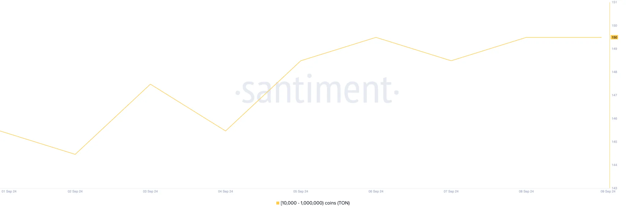 Los datos de Santiment muestran un notable aumento en el recuento de ballenas de TON en los últimos días. Según el proveedor de datos on-chain, las direcciones que holdean entre 10,000 y 1,000,000 TON han aumentado 3% en la última semana.