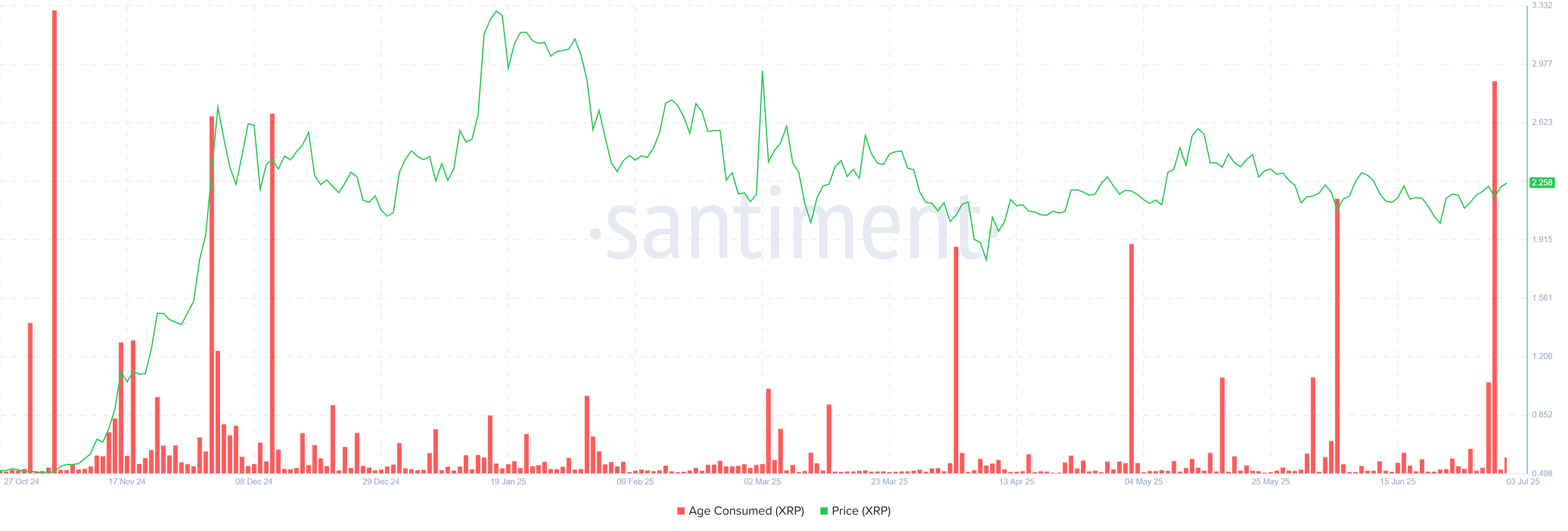 El dato no pasa desapercibido, ya que indica una pérdida de convicción entre los principales actores del ecosistema XRP. A esto se suma un incremento considerable en la métrica conocida como “Age Consumed”, que ha alcanzado un máximo de siete meses.