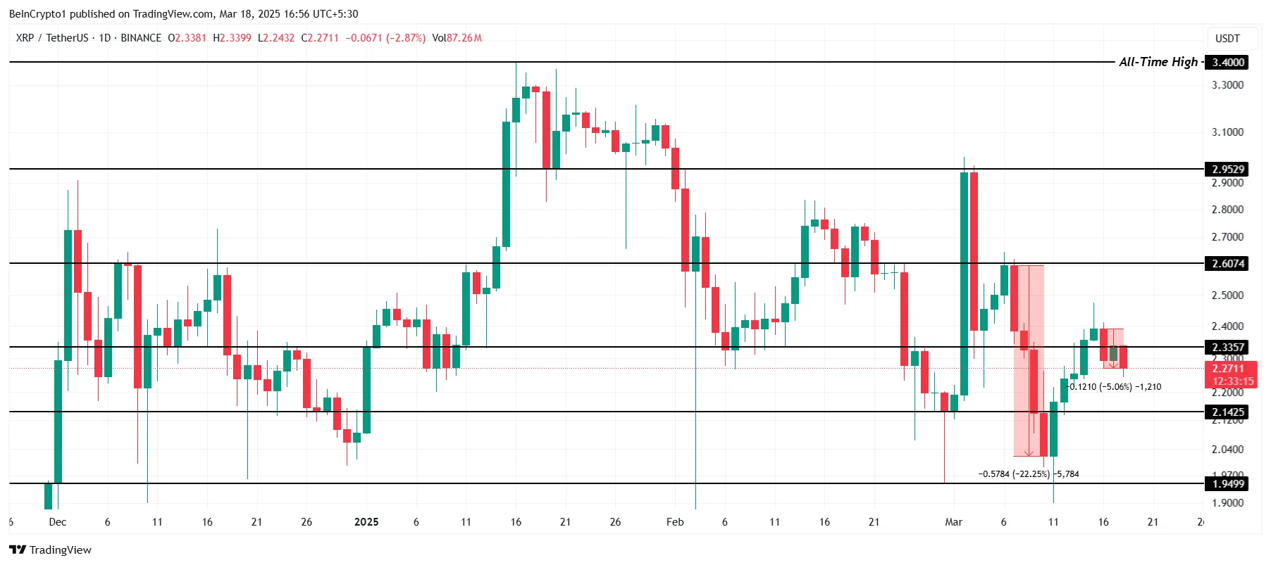 XRP está actualmente negociado a 2,27 dólares, con una caída del 5% en los últimos tres días. La altcoin no ha logrado mantener su soporte en 2,33 dólares y ahora se acerca al próximo nivel crítico de soporte de 2,14 dólares.