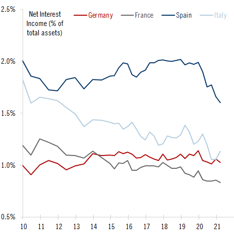 El sector bancario también está notando los estragos de la economía, no sólo en Alemania sino por toda Europa. Los ingresos netos por intereses de los bancos de la zona del euro descendieron a un mínimo histórico en el primer trimestre en porcentaje de los activos, a pesar de las medidas de mitigación del BCE.