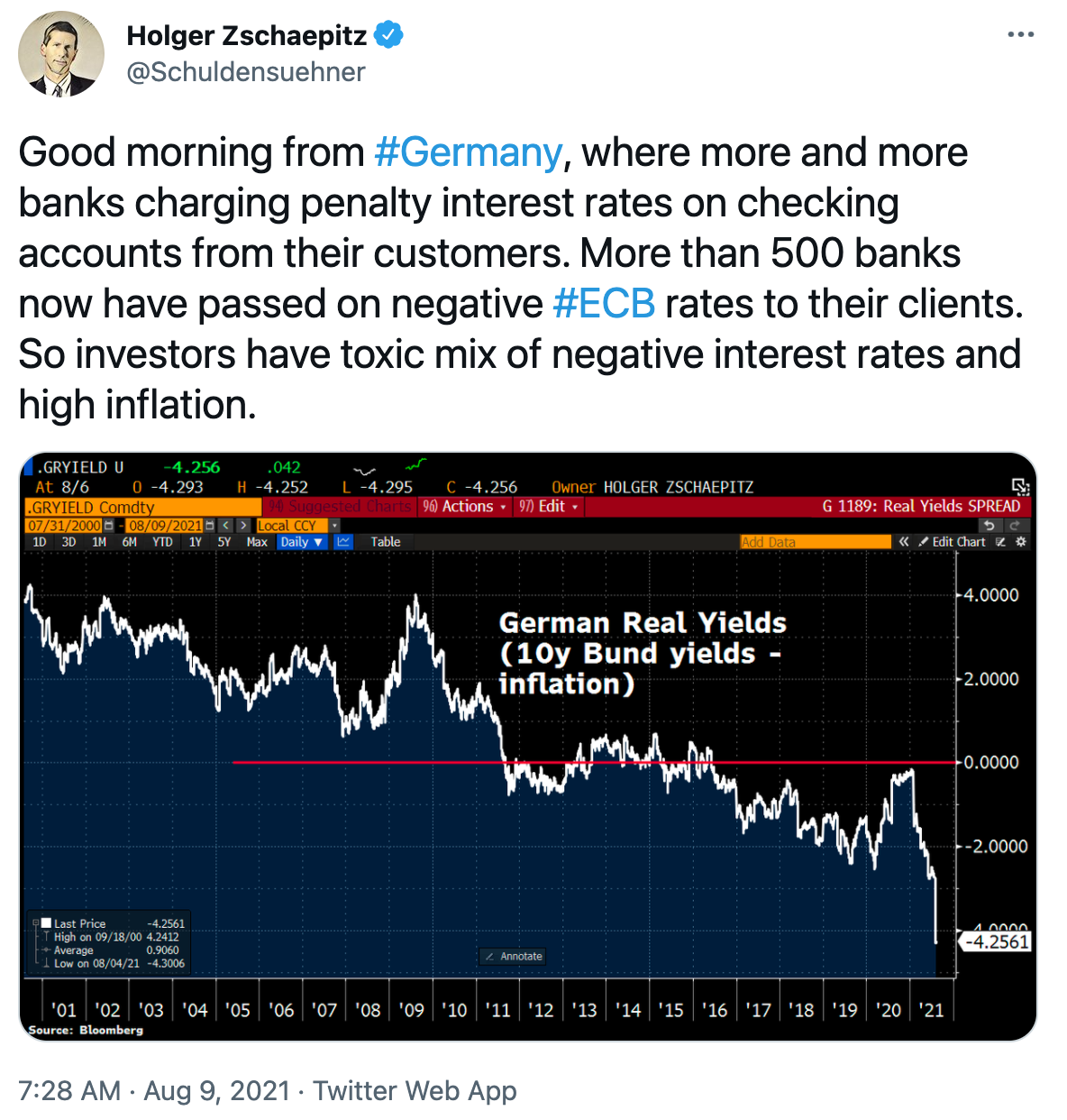 El analista del mercado Holger Zschaepitz ha mostrado una dura realidad para los clientes de los bancos alemanes, el interés negativo es una realidad. Esto significa que los clientes de los bancos están siendo cobrados por depositar su dinero en el banco, empobreciendo sus ahorros.