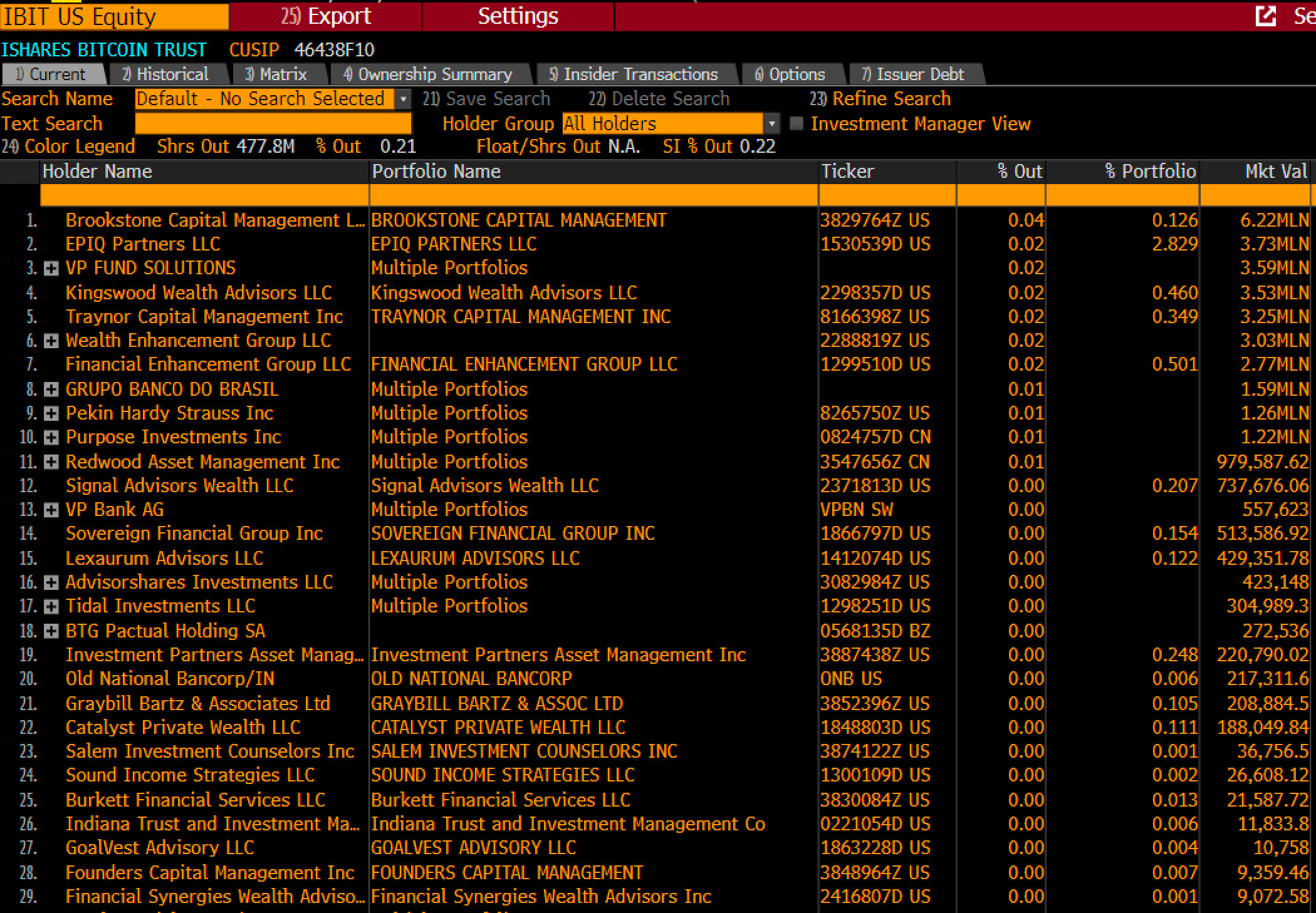 “Hasta ahora hay alrededor de 30 de inversores de #IBIT (en su mayoría fondos y asesores) que representan el 0,2% de las acciones, lo que significa que esta es la punta del iceberg (contexto: BITO tiene el 42% de las acciones reportadas a través de 13F ). También muestra que se están produciendo muchos nibbling, como lo demuestran los pequeños porcentajes de números de puerto.”