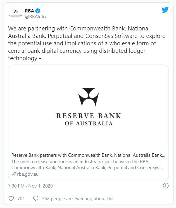 El 2 de noviembre de 2020, el RBA anunció que combinaría los esfuerzos del Banco de la Commonwealth, Banco Nacional de Australia, ConsenSys y Perpetual para desarrollar la moneda digital australiana.