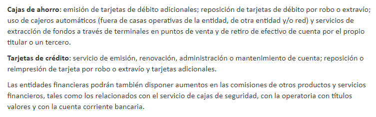 El Banco Central de la República Argentina señaló en una nota de prensa que otros servicios financieros también tendrán ajustes de comisiones, estos son: