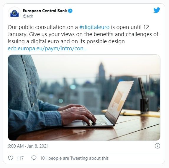 La junta ha estado hablando de las posibilidades de un euro digital durante algún tiempo. Ahora está llevando a cabo una consulta pública sobre el tema hasta el 12 de enero. El tweet del BCE afirma que: