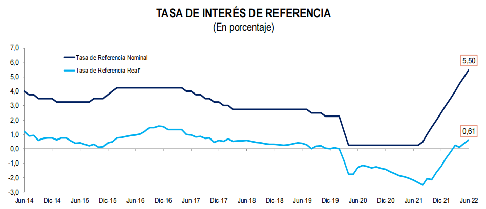 En la nota informativa de su Programa Monetario para Junio de 2022 se informó que el Directorio del BCRP acordó elevar la tasa de interés de referencia en 50 pbs. a 5,50 por ciento, continuando con la “normalización de su posición de política monetaria”. Entre los principales estimulantes a la medida se destacó la crisis internacional a la vez que un incremento en las expectativas inflacionarias.