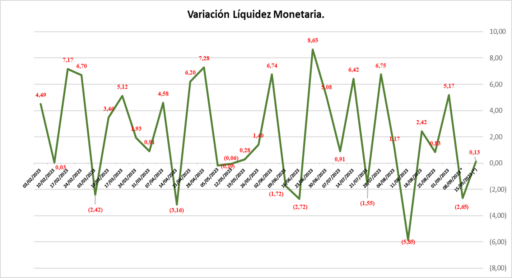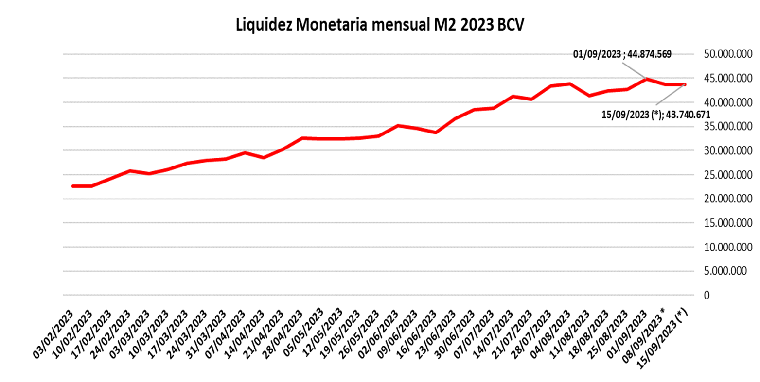 Por esto el gobierno recurre al Banco Central. Este emite constantemente una gran cantidad de dinero que aumenta la base monetaria del país. Para que se entienda, nada más en el periodo enero-julio del 2023 la masa monetaria pasó de 22 mil millones de bolívares a 46 mil millones.