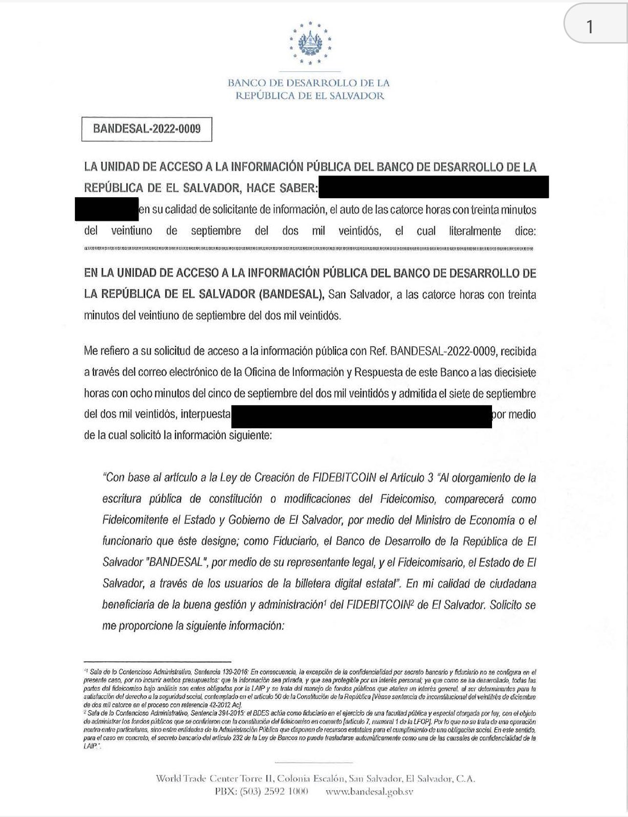 BANDESAL está a cargo de administrar los fondos utilizados por el gobierno salvadoreño para sus proyectos de Bitcoin. ALAC criticó a BANDESAL por la medida debido a que considera que esta limita las posibilidades de acceso a la información de la ciudadanía salvadoreña.