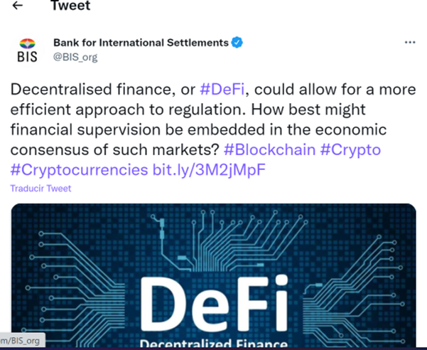 El Banco de Pagos Internacionales, una de las instituciones intergubernamentales más importantes en el sector financiero internacional, y que ha tenido una postura de “riesgo” ante la industria de las criptomonedas y la tecnología blockchain, abogando por una fuerte regulación a este sector, ha señalado en un estudio que la regulación en Defi debe permanecer neutral desde el punto de vista tecnológico, la supervisión debe evolucionar en paralelo a la tecnología