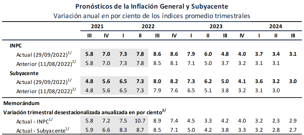 “Las presiones inflacionarias acumuladas derivadas de la pandemia y del conflicto bélico continúan afectando a las inflaciones general y subyacente, que en la primera quincena de septiembre registraron tasas anuales de 8.76% y 8.27% respectivamente; manteniéndose en niveles no observados en dos décadas. Las expectativas correspondientes para 2022 y 2023 volvieron a incrementarse. Las de mediano plazo exhibieron en el margen cierto ajuste al alza. Y las de largo plazo se mantuvieron estables, si bien por arriba de la meta”.
