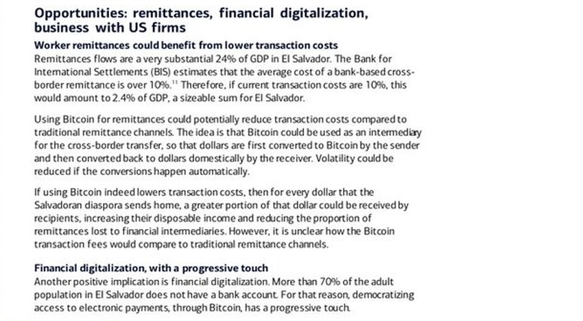 El informe, publicado el 26 de julio, habla sobre el punto de vista económico general de El Salvador, y la sección en cuestión habla ampliamente sobre las oportunidades en remesas, digitalización y operaciones comerciales. El autor cree que la adopción de Bitcoin puede ayudar con todos estos aspectos de la economía.