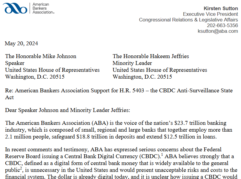 La ABA expresó en una carta dirigida al presidente de la Cámara, Mike Johnson, y al líder de la minoría, Hakeem Jeffries, que una CBDC, entendida como una forma digital de dinero del banco central disponible para el público en general, es innecesaria en Estados Unidos. En especial porque conllevaría riesgos y costos inaceptables para el sistema financiero.