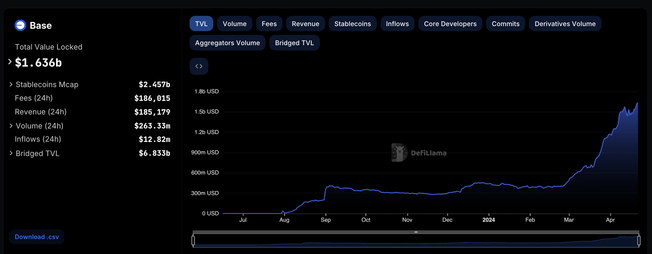 SponsoredBeInCrypto reportó que, aunque Arbitrum y Optimism (OP) siguen siendo las L2 líderes en TVL general, Base está ganando terreno rápidamente. Es decir, a Base le ha tomado días representar el 10% de los 41,03 mil millones de TVL que tenían los proyectos de escalabilidad hasta los primeros días de abril.