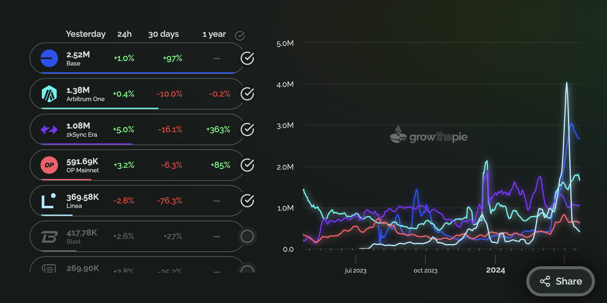 Datos de Grow the pie mostraron que Base tiene transacciones diarias por más de 2,52 millones, las cuales crecen diariamente y que en pocos días podrían diferenciarse de marzo con 97%. El 21 de abril, Base rebasó a las Capas 2 Arbitrum One, zkSync Era, OP Mainnet y Linea, quienes tuvieron: 1,38 millones, 1,08 millones, 591,6 mil y más de 369 mil, respectivamente.