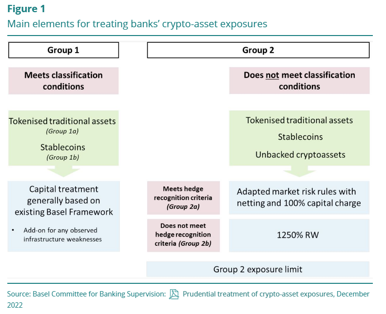 El marco de Basilea asigna a las criptomonedas sin respaldo la puntuación de riesgo más alta del 1,250%, lo que aumenta los requisitos de capital para que los bancos hagan negocios con ellas.