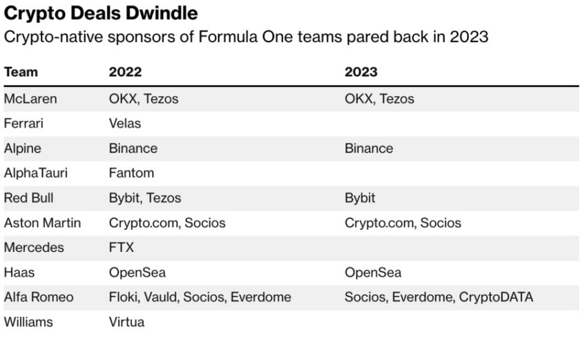 Una imagen muy diferente surgió cuando el equipo reveló sus autos 2023 en la carrera de debut de esta temporada el fin de semana pasado. Si bien todos los equipos tenían al menos un patrocinador de criptomonedas el año anterior, esa cifra ahora se ha reducido al 60%, y es probable que disminuya aún más.