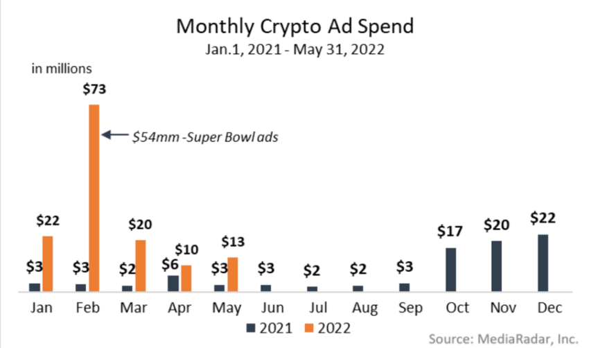 Las empresas cripto gastaban en cualquier lugar y en todas partes. De hecho, hasta octubre de 2022, las marcas relacionadas con cripto desembolsaron 223 millones de dólares en anuncios en Estados Unidos. Esto fue 150% más que 89 millones de dólares para todo 2021, según MediaRadar.