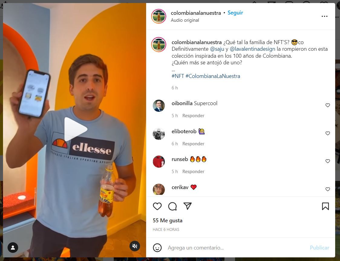 “Quisimos dar un nuevo paso en el mundo virtual con Colombiana y encontramos en Sajú y La Valentina, a los mejores aliados para crear desde el reciclaje unas gafas únicas, icónicas, completamente representativas de nuestra marca en sus colores e identidad, hechas con tapas a las que se les da un nuevo uso. De esa forma, creamos una pieza de culto con la garantía de autenticidad y valor que dan los NTF”.