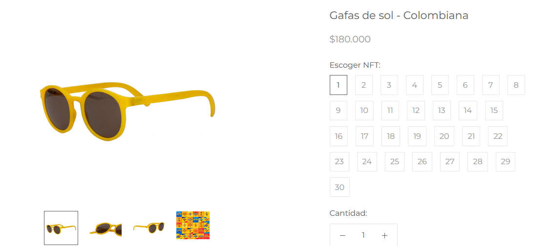“Edición especial de 30 gafas certificadas por medio de NFT’s hechas a partir de tapas de las botellas de la gaseosa Colombiana, la nuestra. Seleccione un número y ese será el NFT que se le dará: son 30 NFT’s disponibles.”