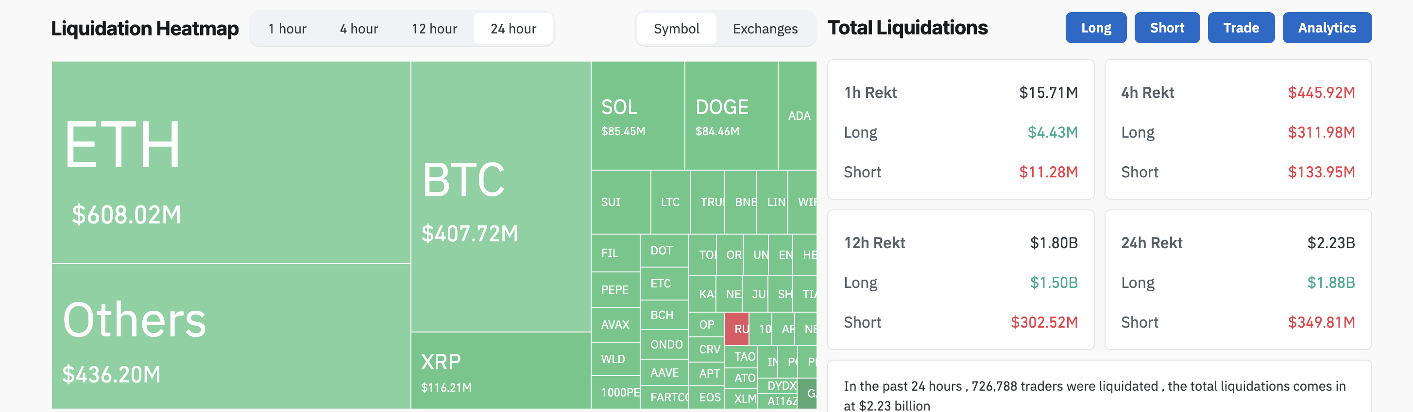 Del total de liquidaciones, 1,88 mil millones de dólares provinieron de posiciones largas y 349,81 millones de dólares de posiciones cortas. En total, 726,788 traders fueron liquidados.