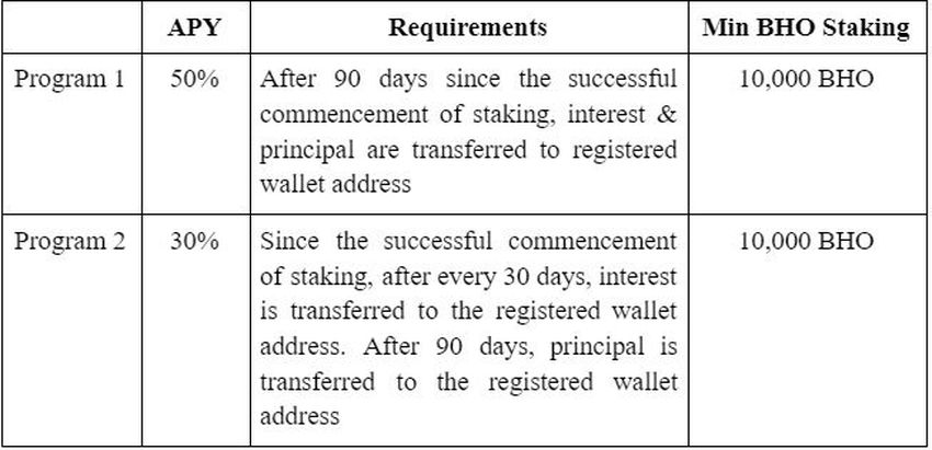 Hay dos programas dentro del evento Staking Rewards con los detalles a continuación. No hay un límite máximo de BHO para staking, y se puede usar una dirección de monedero para ambos programas. Los inversores no podrán agregar más BHO después de que hayan completado la transferencia de tokens a la dirección del monedero de staking de Bholdus.