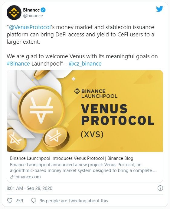 El 28 de septiembre de 2020, la compañía anunció el Protocolo Venus, un protocolo de mercado monetario para su Smart Chain. El proyecto debutará a través del Launchpad del exchange, una plataforma popular para nuevos tokens.