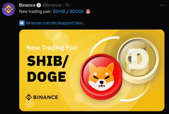 “Binance abrirá operaciones para el par de trading SHIB/DOGE el 2021-11-02 08:00 AM (UTC)”.