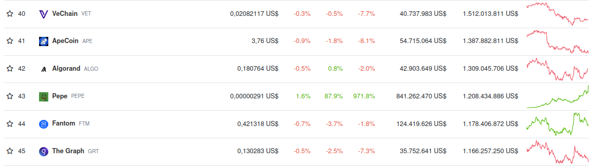 PEPE ha logrado superar a criptomonedas populares como Fantom (FTM) y The Graph (GRT) y se encuentra al acecho de Algorand (ALGO), Apecoin (APE) y VeChain (VET).